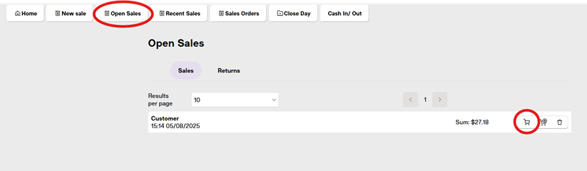 Locate the sale you wish to resume and select the small shopping cart on the right side of the line.
