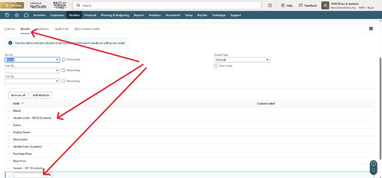 - Ex) Brand, Vendor Code, Name, Vendor Color, Purchase Price, Base Price, Season – OF1 (Custom)