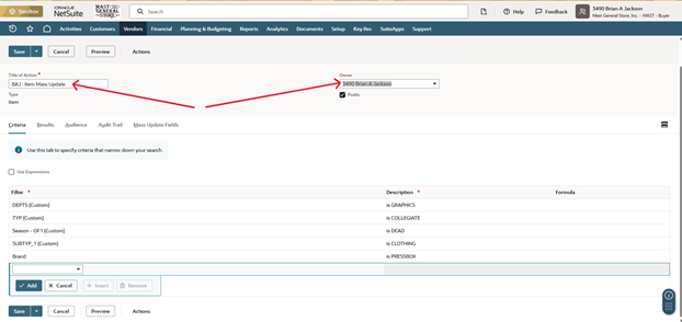 - Click Save and the Mass Update will begin the process of changing the information for EVERY ITEM ON THE LIST THAT IS SELECTED